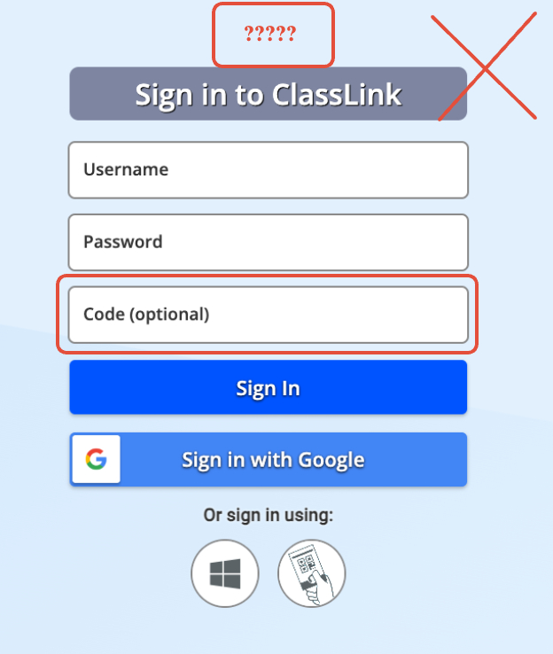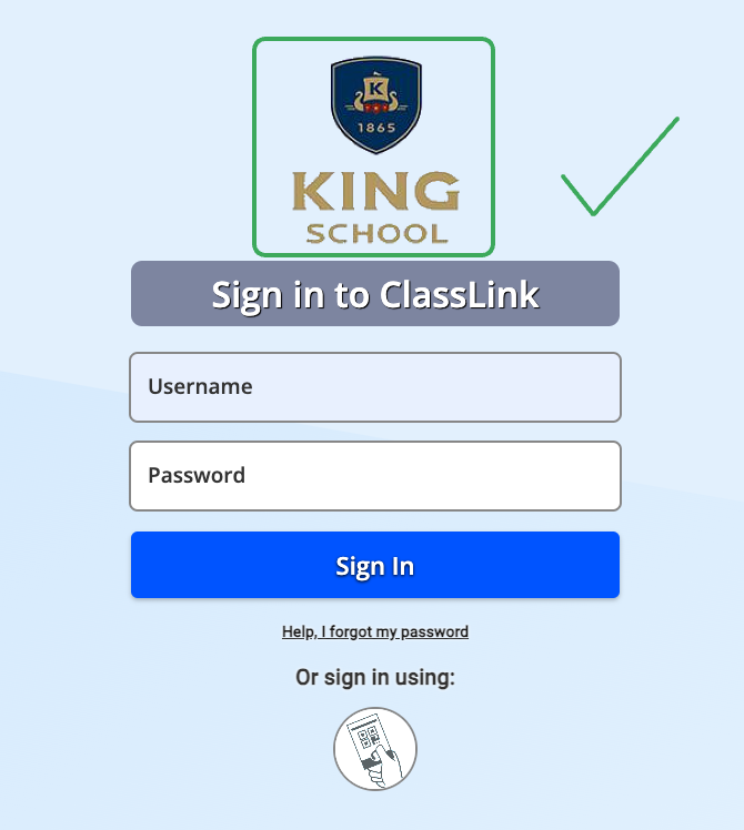 Make sure to use the link provided above. To access King School's ClassLink portal, you need to open it using the correct Launchpad. Here's a rule of thumb: if you don't see the King School logo on the ClassLink sign-in page and you see a Code (optional) text field, you are NOT on the correct webpage.