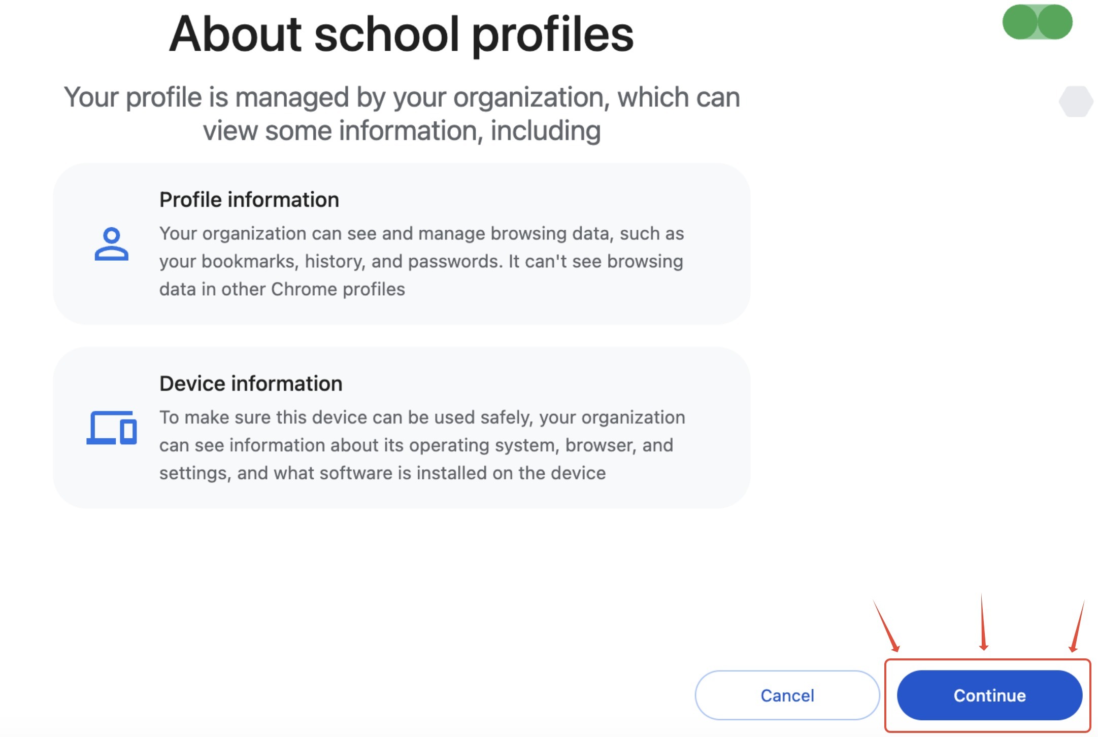 4. After entering the King School email address and password, you will see a prompt that says “Your organization will manage this profile.” Please click Continue. We will only be able to manage the settings within the King School Chrome profile - we will not have access to your device.